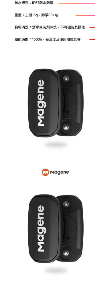 - 心率精度:±1BPM防水等級:IP67防塵防水重量:主機連接器16g,胸帶30g±1g